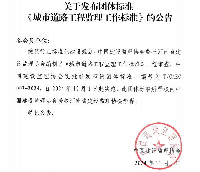 關于發布團體標準《城市道路工程監理工作標準》的公告