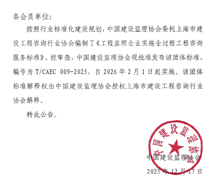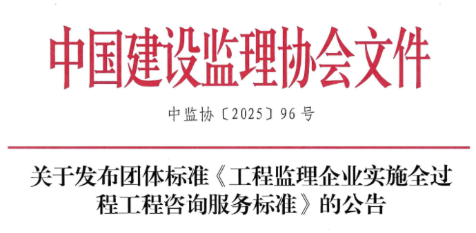 關(guān)于發(fā)布團(tuán)體標(biāo)準(zhǔn)《工程監(jiān)理企業(yè)實(shí)施全過程工程咨詢服務(wù)標(biāo)準(zhǔn)》的公告