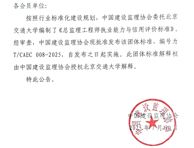 關于發布團體標準《總監理工程師執業能力與信用評價標準》的公告
