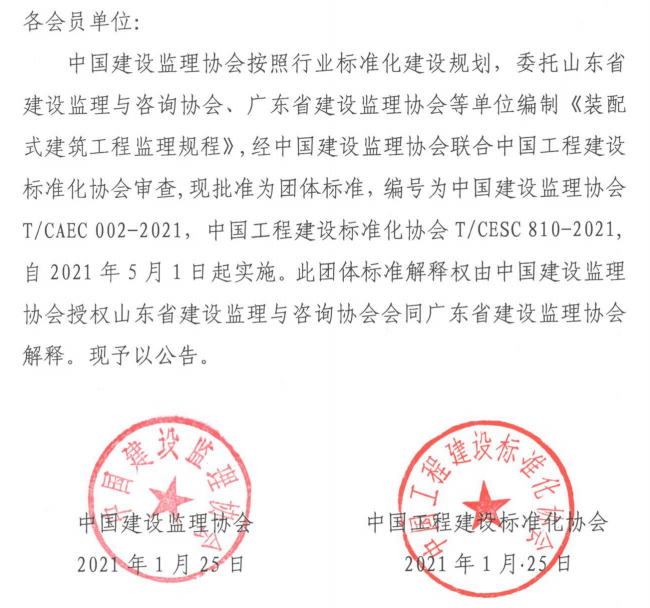 關于發布《裝配式建筑工程監理規程》團體標準的公告