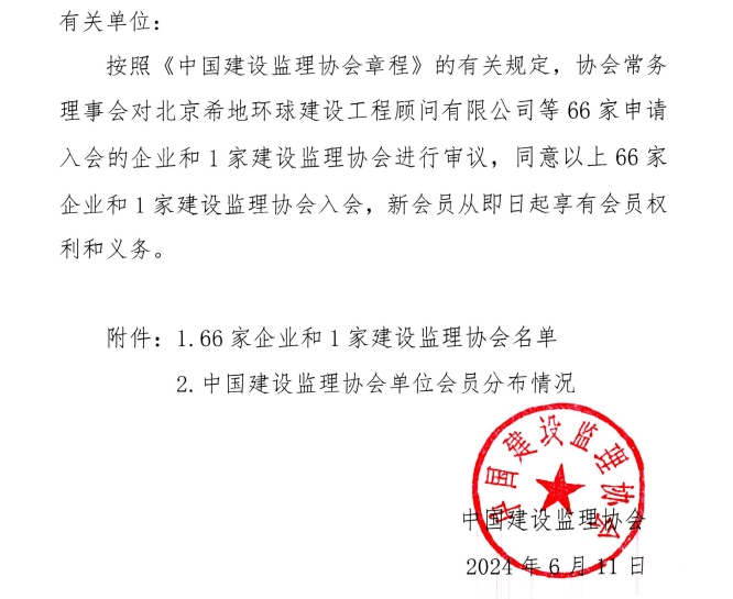 關于同意北京希地環(huán)球建設工程顧問有限公司等66家企業(yè)和1家建設監(jiān)理協(xié)會入會的通知