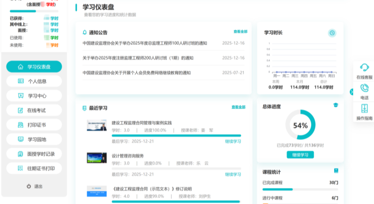 新系統采用規范化視覺設計與簡潔交互邏輯,界面布局規整,功能分區清晰。左側固定菜單欄聚合全部核心操作入口,右側及底欄設置幫助支持通道,關鍵功能一鍵直達;摒棄冗余操作環節,簡化導航路徑,無論是課程選擇、學時查詢還是證書打印,均能快速完成,切實提升使用效率。