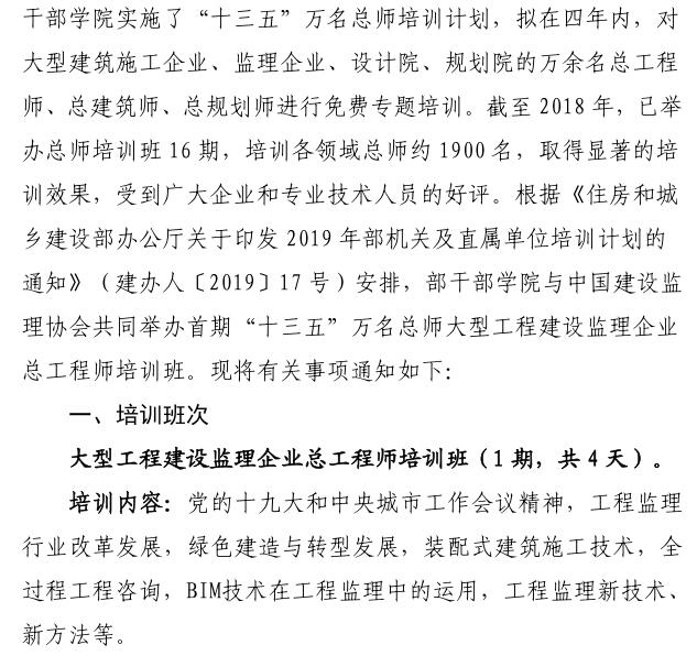 關于舉辦2019年“十三五”萬名總師大型監理企業總工程師培訓班的通知
