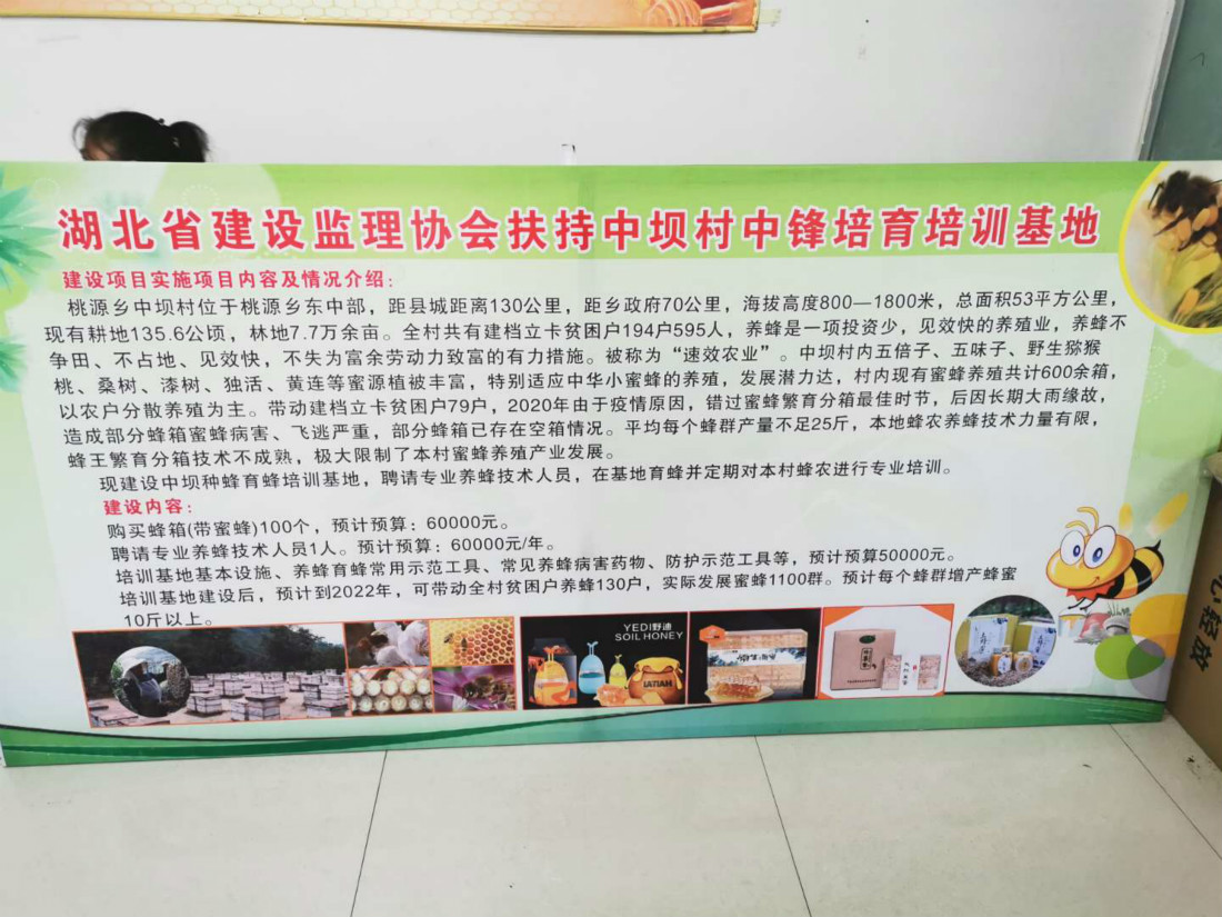 在第七個“國家扶貧日”到來之際,10月15日,湖北省建設監理協會與我省十堰市竹溪縣蜂業協會簽約,與武漢工程監理咨詢有限公司攜手共同提供10萬元幫扶資金,助力十堰市竹溪縣桃源鄉中壩村發展養蜂產業。我會是來竹溪縣開展捐贈活動的第一個省級社會組織。