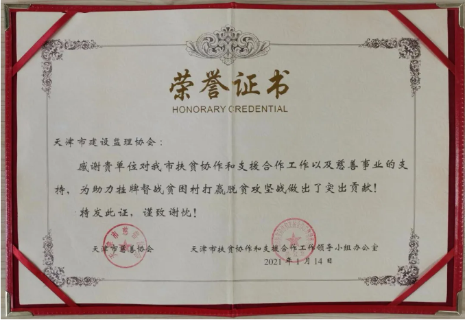 天津市扶貧協(xié)作和支援合作工作領(lǐng)導(dǎo)小組辦公室為我會頒發(fā)了榮譽證書,感謝協(xié)會對我市扶貧協(xié)作和支援合作工作以及慈善事業(yè)的支持,為助力掛牌督戰(zhàn)貧困村打贏脫貧攻堅戰(zhàn)做出了突出貢獻!