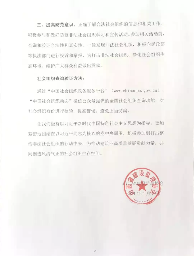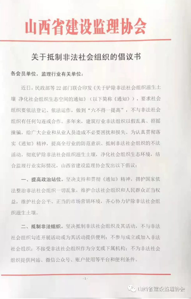 近日,民政部等22部門(mén)聯(lián)合印發(fā)《關(guān)于鏟除非法社會(huì)組織滋生土壤 凈化社會(huì)組織生態(tài)空間的通知》(以下簡(jiǎn)稱《通知》),要求社會(huì)組織要依法登記、依法運(yùn)作,做到“六不得一提高”,不與非法社會(huì)組織有任何勾連或合作。多年來(lái),建筑行業(yè)非法組織以假亂真、招搖撞騙,給廣大企業(yè)和從業(yè)人員造成不必要困擾和損失。為認(rèn)真貫徹落實(shí)《通知》精神,提高全行業(yè)的防范意識(shí)、抵制非法社會(huì)組織的不法活動(dòng),徹底鏟除非法社會(huì)組織滋生土壤,凈化社會(huì)組織生態(tài)環(huán)境,結(jié)合監(jiān)理行業(yè)實(shí)際情況,山西省建設(shè)監(jiān)理協(xié)會(huì)發(fā)出以下倡議: