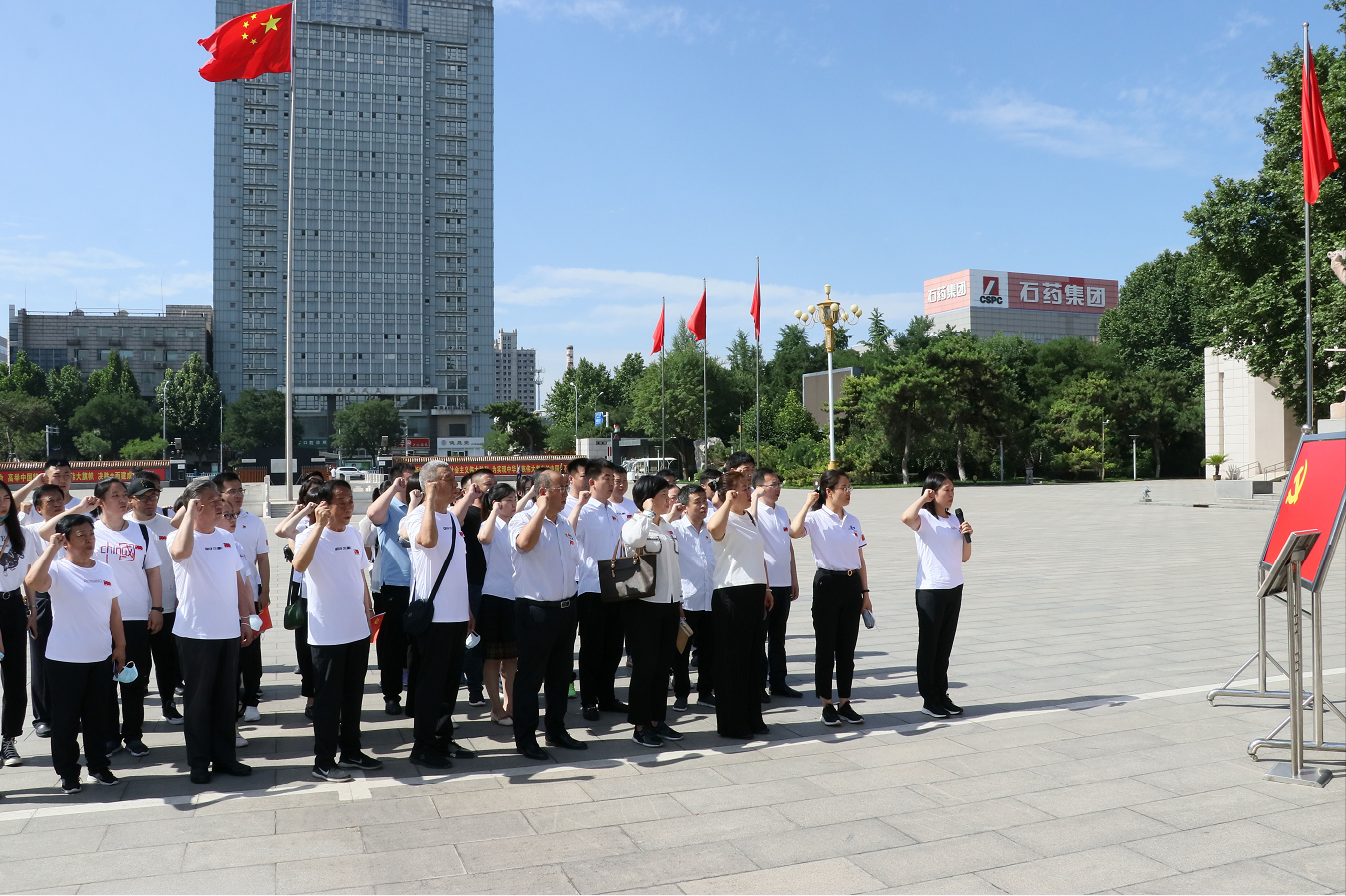 在華北軍區烈士陵園,全體黨員懷著崇敬的心情,緬懷革命英烈,致敬英雄,向為國犧牲的烈士行三鞠躬禮,默哀致敬;全體黨員高舉右手,面對鮮紅的黨旗,再次莊嚴宣誓:“我志愿加入中國共產黨……隨時準備為黨和人民犧牲一切,永不叛黨”。
