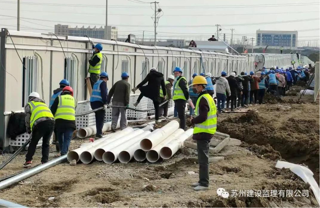 抗疫安置房建設(shè) 根據(jù)抗疫防疫需要,蘇州市市政建設(shè)管理處組織建設(shè)新冠抗疫安置房項(xiàng)目,共計(jì)建設(shè)約600間箱式房,2月17日晚八點(diǎn)開始,2月23日完成。工期緊,任務(wù)重,施工單位組織多家施工班組實(shí)行三班倒施工,最多時(shí)日投入約2000人次。蘇州建設(shè)監(jiān)理有限公司選派出7人進(jìn)駐現(xiàn)場(chǎng)日夜工作,提供專業(yè)志愿服務(wù),白班4人,夜班3人。經(jīng)過(guò)與風(fēng)雪嚴(yán)寒、勞累困乏作斗,艱苦奮戰(zhàn),歷時(shí)6個(gè)日夜工作,終于完成建設(shè)任務(wù)。