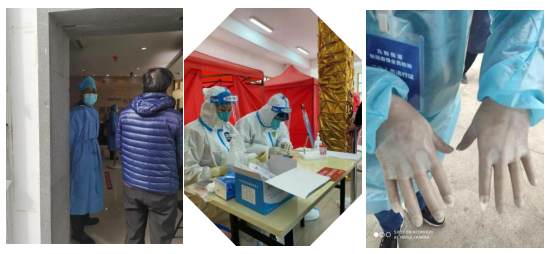 核酸檢測(cè)服務(wù) 志愿者中,絕大部分是作為核酸檢測(cè)采樣點(diǎn)位“二碼”檢查、信息錄入、材料運(yùn)送、秩序維護(hù)等,大部分此類工作往往由年輕美麗的姑娘志愿者來(lái)完成,雖然隔著霧氣迷蒙的面罩,但她們以青春熱情的身姿、溫婉燦爛的笑容,與醫(yī)護(hù)、社區(qū)、政府機(jī)關(guān)的抗擊工作者一起,驅(qū)散了疫霾的憂緒和恐慌、遏制了疫情邊界的擴(kuò)溢。2月中旬,蘇州的天氣陰冷潮濕,尤其是凌晨時(shí)分,時(shí)有冷雨小雪,穿上脫卸比較麻煩的防護(hù)服,忙得身上大汗淋漓,志愿者們往往無(wú)暇顧及喝水吃飯,而雙手因?yàn)楸”〉氖痔谆蛘咭淮斡忠淮蔚南词窒径鴥龅媒┯布t腫。但志愿者們沒有一個(gè)有怨言的,他們以苦為樂彼此守望,全身心戰(zhàn)斗在核酸檢測(cè)的第一線。