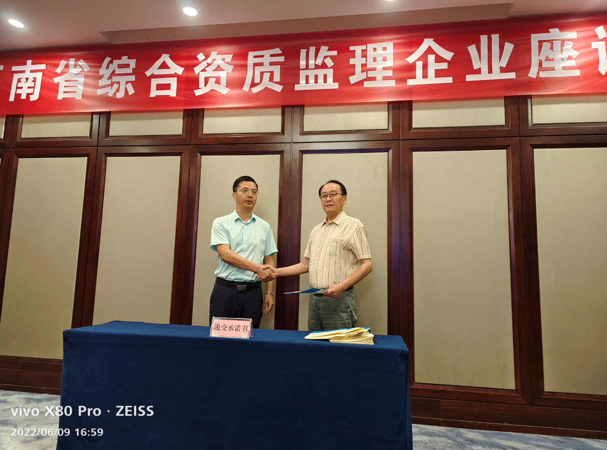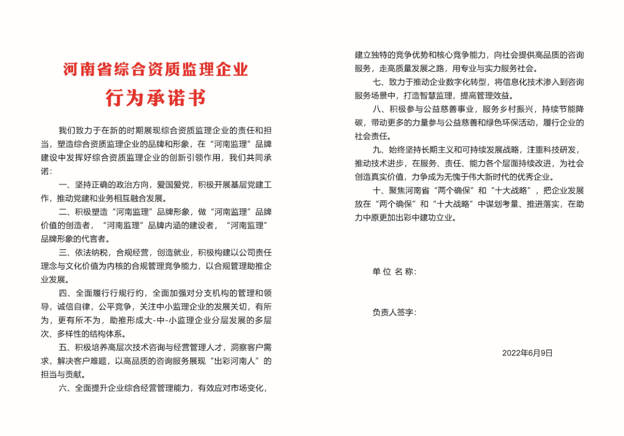 會上,綜合資質(zhì)監(jiān)理企業(yè)負(fù)責(zé)人就展現(xiàn)綜合資質(zhì)監(jiān)理企業(yè)的責(zé)任與擔(dān)當(dāng),維護(hù)“河南監(jiān)理”品牌聲譽(yù)與形象,從政治方向、品牌建設(shè)、合規(guī)運(yùn)營、管理能力、誠信自律、人才建設(shè)、數(shù)字轉(zhuǎn)型、社會責(zé)任、智慧監(jiān)理、服務(wù)大局十個方面向社會做出行為承諾,簽署了《綜合資質(zhì)監(jiān)理企業(yè)行為承諾書》。