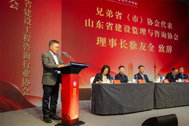 山東省建設(shè)監(jiān)理與咨詢(xún)協(xié)會(huì)理事長(zhǎng)徐友全代表各省市協(xié)會(huì)致祝賀詞。