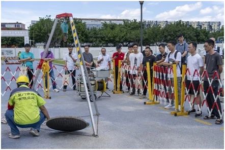 由市政有限空間作業有限公司專業隊伍開展地下有限空間作業及應急處置,演練人員穿戴防護設備密切配合、協調聯動,做到組織有序、處置有力、流程規范、防護到位,通過學習正確的作業流程及救援措施,使學員們對有限空間作業常識有了更加直觀的了解,對有限空間作業防范意識有所增強,對抗擊突發事件的應變能力有所提高。