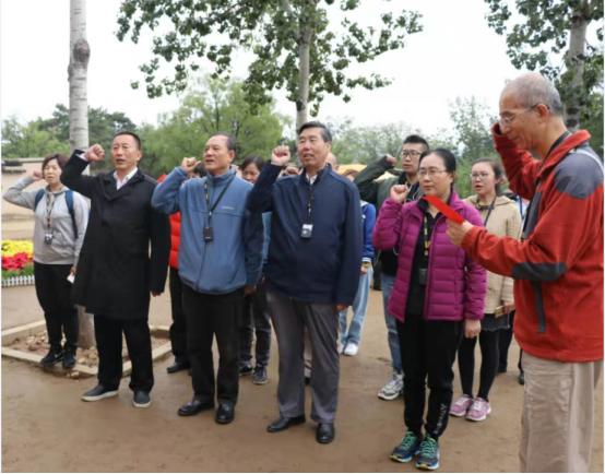 在中共中央七屆二中全會會址前,秘書處全體黨員面對鮮紅的黨旗,莊嚴地舉起右手重溫入黨誓詞,立下自己對黨忠誠的誓言,表達了做合格黨員及為黨的事業(yè)奮斗終身的決心和愿望。