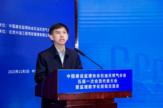 2023年11月3日,中國建設監理協會石油天然氣分會五屆一次會員代表大會暨監理數字化經驗交流會在北京陽光和怡塔里木酒店報告廳順利召開。中國建設監理協會石油天然氣分會會長、中國石油項目管理公司執行董事、黨委書記許賢文,中國建設監理協會副會長李明安,中國石油天然氣集團有限公司工程和物裝部副總經理周樹彤,中國石油天然氣集團有限公司工程和物裝管理部工程質量監督處處長李冬巖,特邀嘉賓上海建科工程咨詢有限公司執行董事、黨委書記張強,重慶賽迪工程咨詢有限公司數字化中心主任馮寧,以及分會副會長、理事、會員單位代表共73人出席會議。會議由分會副會長兼秘書長劉玉梅、中國石油北京項目管理公司項目管理部主任李海鵬分別主持。