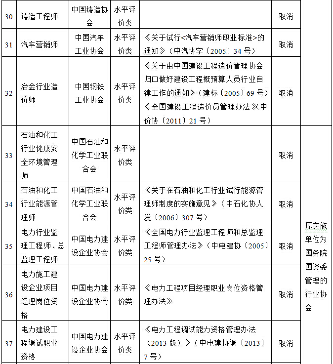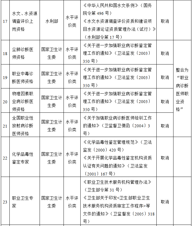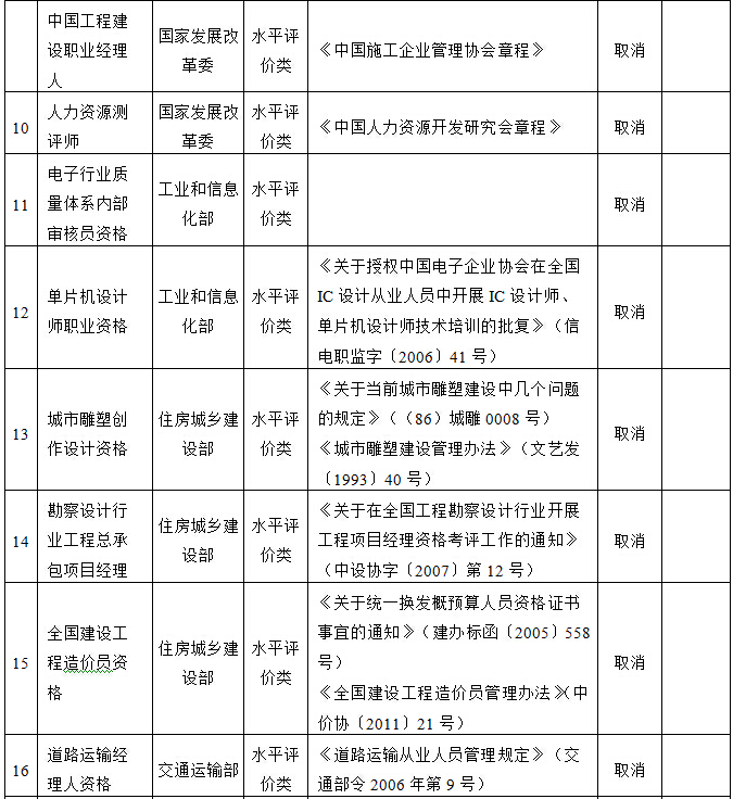 一、取消的專業技術人員職業資格許可和認定事項(共計43項,其中準入類5項,水平評價類38項)