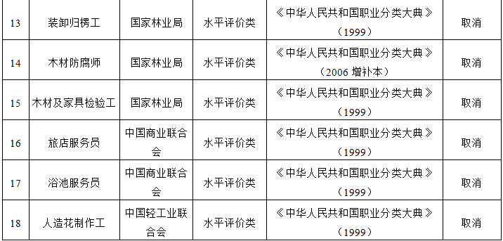 二、取消的技能人員職業資格許可和認定事項(共計18項,均為水平評價類)